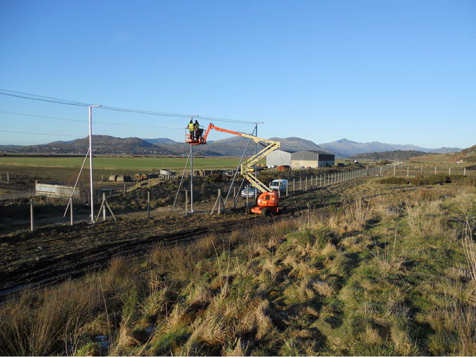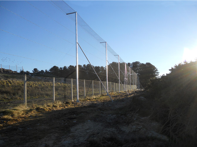 All posts were specially designed to be bolted down to a concrete foundation and each intermediate post fitted with additional lugs to attach a backstay for added strength. Installation was completed in two visits. First digging and setting the 1m3 concrete foundations, then delivery and installation of almost 8m (26Ft) long posts secured using resin anchors. For cladding the fence an all terrain Mobile Elevating Work Platform (MEWP) was used together with over 900m of 6mm multi strand wire rope and over 9500 plastic ties.