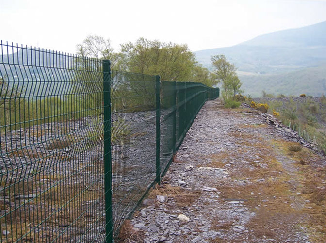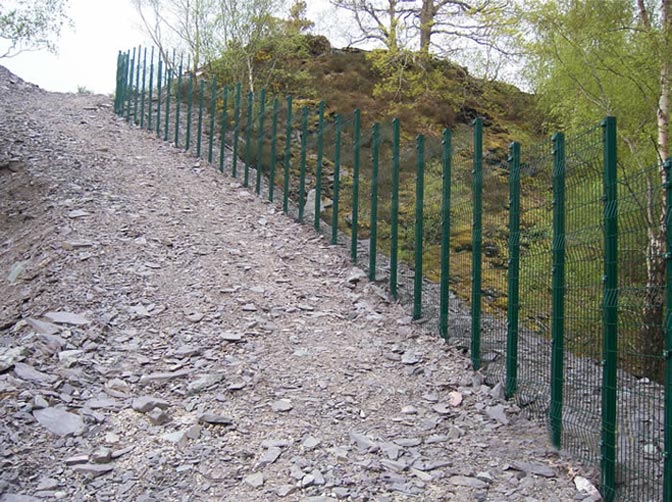 We worked closely with Jones Bros Civil Engineering UK to install a total of 952m of 2m high V-mex fencing supplied by IAE Fencing of Stoke-on-Trent. The site was particularly difficult as it is an old quarry which meant that digging conditions were very hard. An added complication was that approximately 350m of the fence-line was on a steep slope which is not well suited to a weld-mesh panel system. We overcame this problem by having posts at 1m centres, as shown in the photographs below.