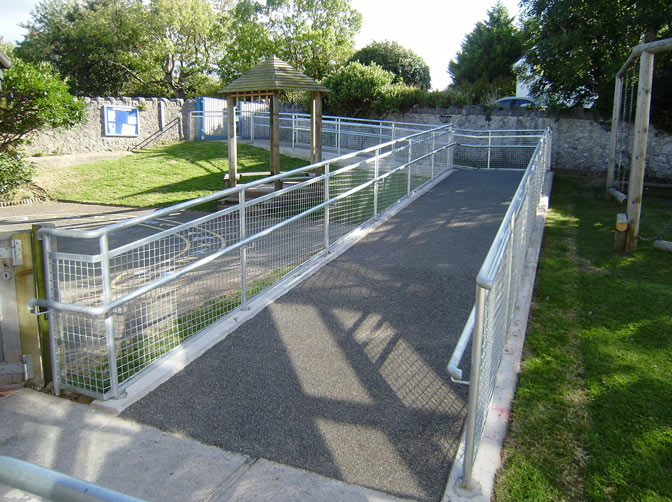 To overcome this problem we were appointed to work with a local civil engineering contractor who laid the required concrete and tarmac ramp. Once they were at a stage where they determined where the finish levels were, we were able to take the measurements and proceed to fabricationg the handrails. We created drawings for the main contractors for approval, upon which we completed installation within 3 weeks.