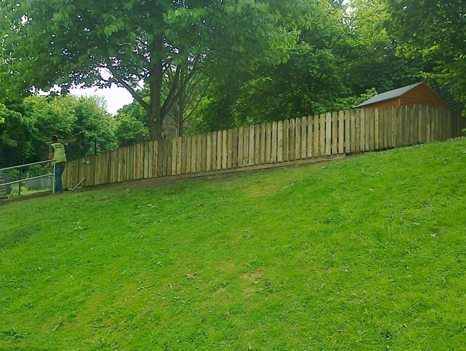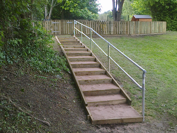 The nursery at Ysgol Porth y Felin needed a new enclosure for the children to be able to safely play in. The only area they had was at the top of a short hill, so a new set of timber framed steps was required together with a steel handrail.
